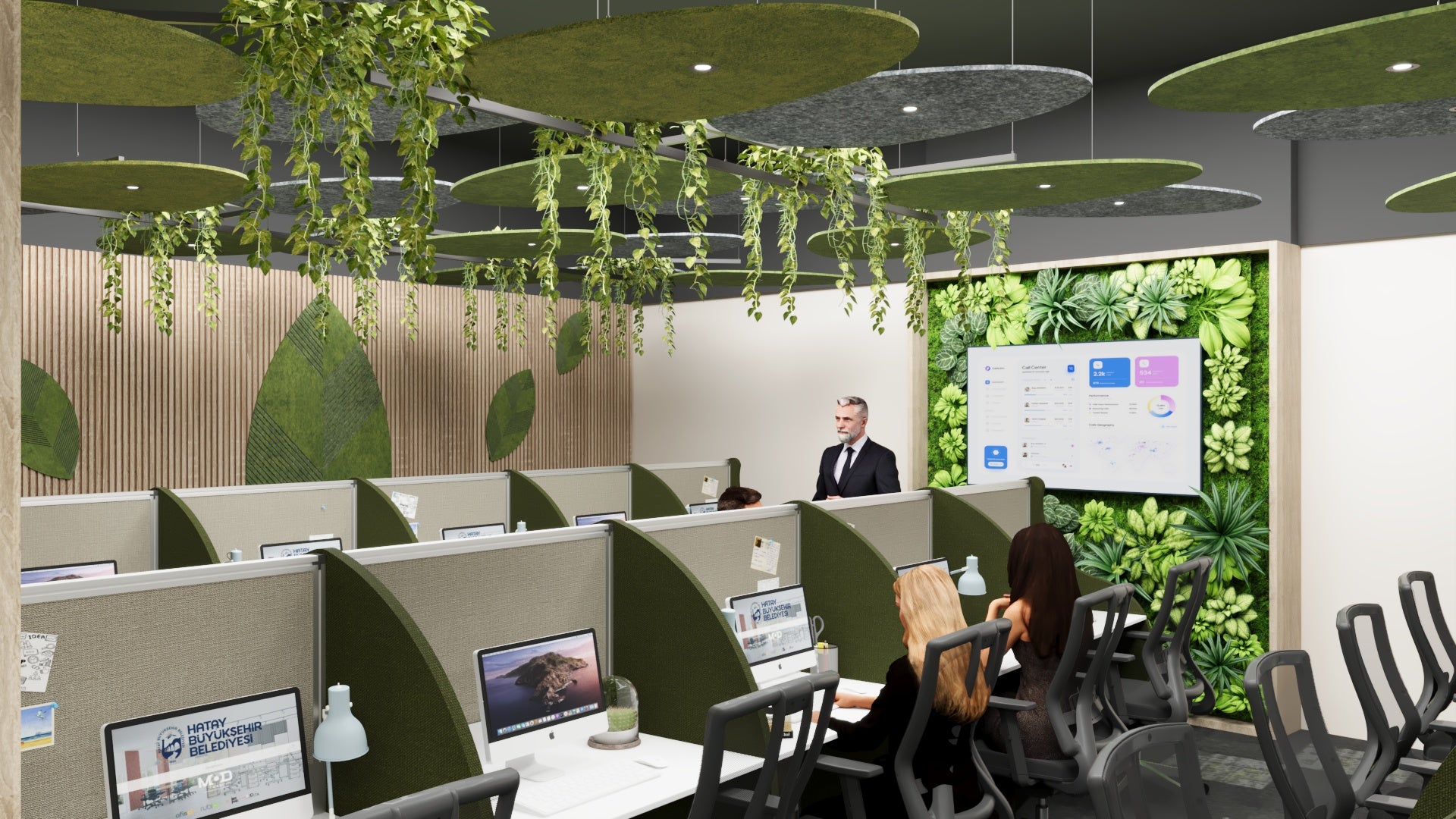 Inspired by the city-specific values of Hatay during its reconstruction process, this office and call center interior design combines different shades of green with the elegance of laurel and olive leaves.