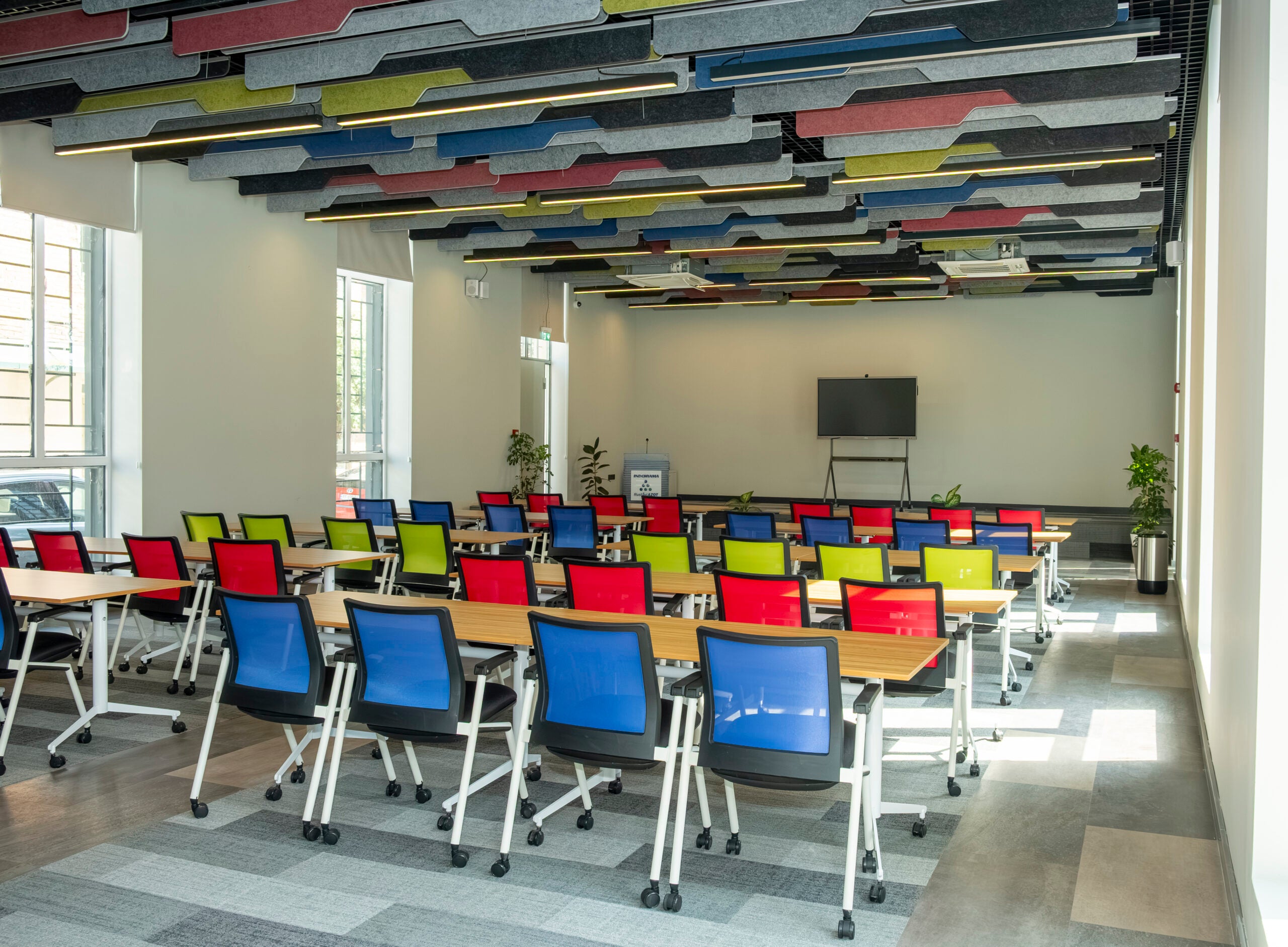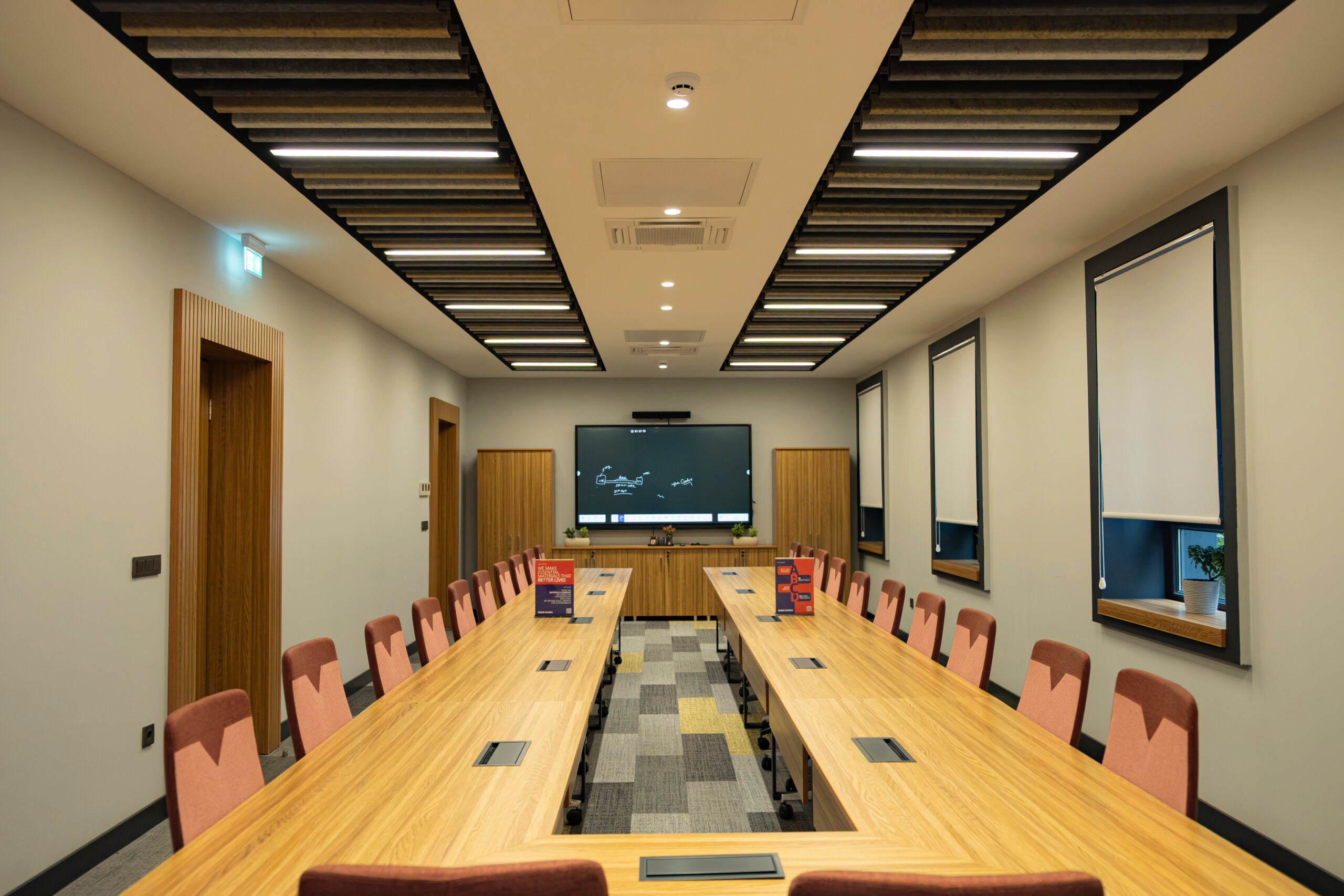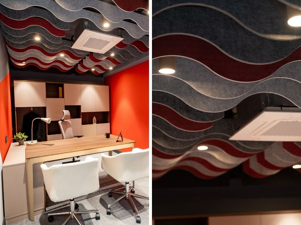 With its modern lines and wavy design, it combines both aesthetics and functionality. Special details that support ceiling acoustics enhance meeting efficiency and add elegance to the space.