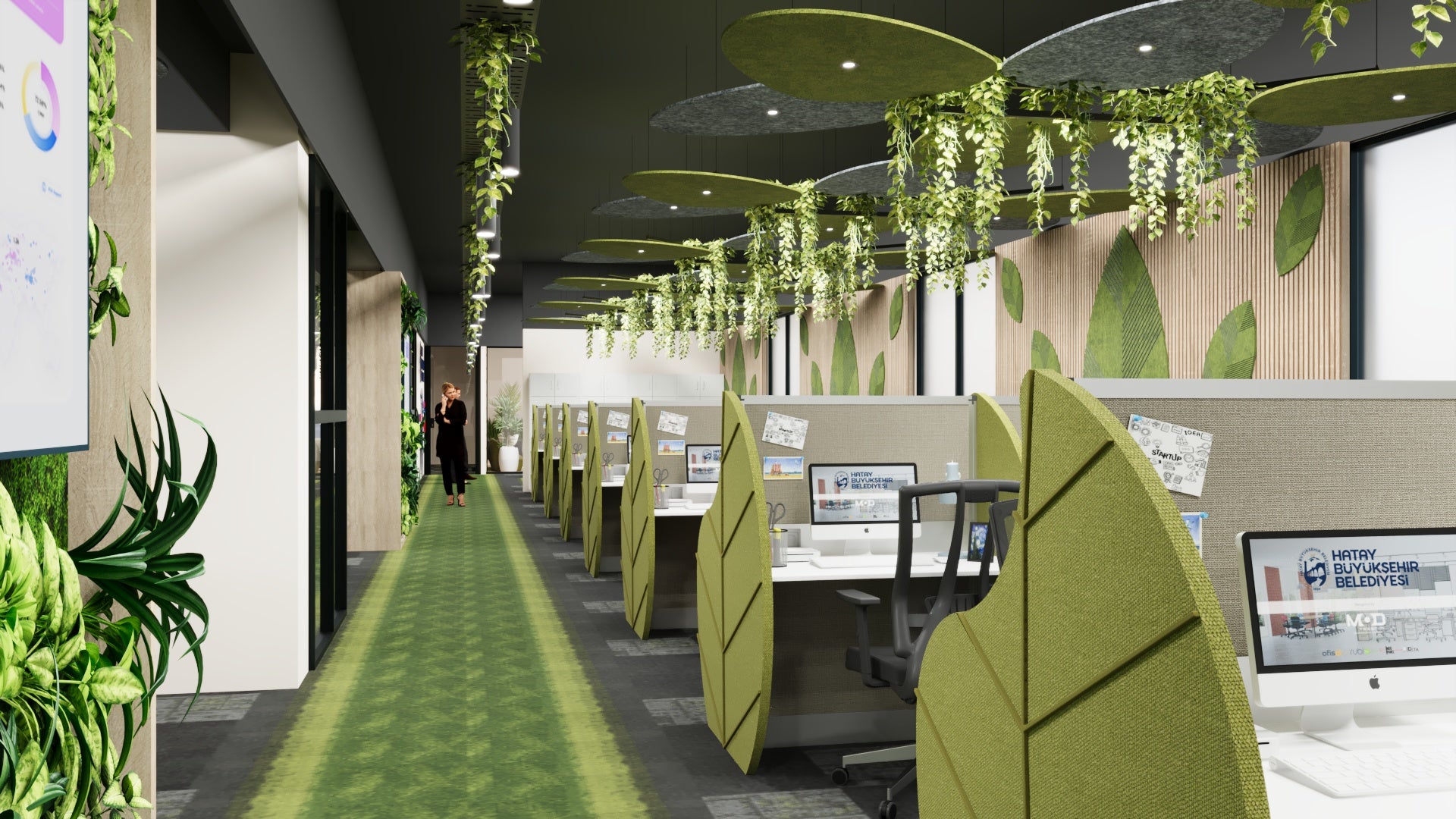 While leaf-patterned acoustic ceiling panels provide both sound comfort and aesthetic balance, this nature-inspired design reflects Hatay's greenery, peace, and rebirth energy into the office environment.